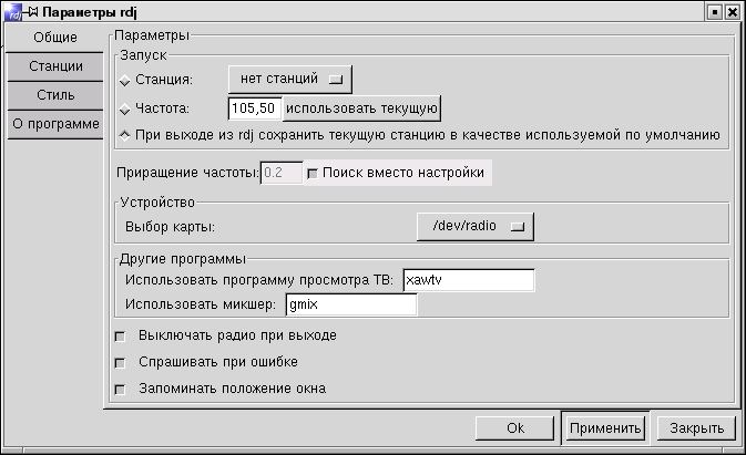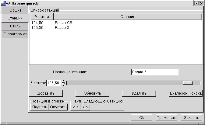 - При первом запуске rdj будет предложено поискать станции и настроиться: Вы можете просканировать, а можете просто задать частоты и названия любимых радиостанций и добавить их в список выбора: