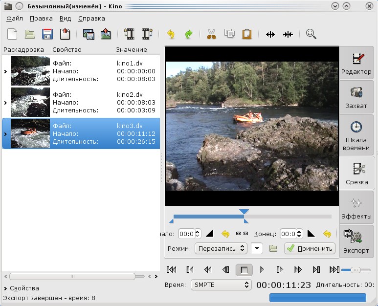 - Жмём кнопку Экспорт и создаём маленький свой фильм из кусков сцен в формате DivX.