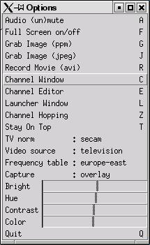 XAWTV предназначена для просмотра телевизионных программ в Linux-е и для захвата аудио/видео, используя TV-тюнер, известный системе. Сразу замечу, что в большинстве Linux-ов есть более удобная программа с человеческим интерфейсом - TVTIME.