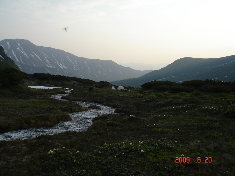 Палатки стоят у ручья, который бежит из большого снежника. Рядом есть сухие ветки для костра. Можно спрятать палатки от ветра между камней и стланника.