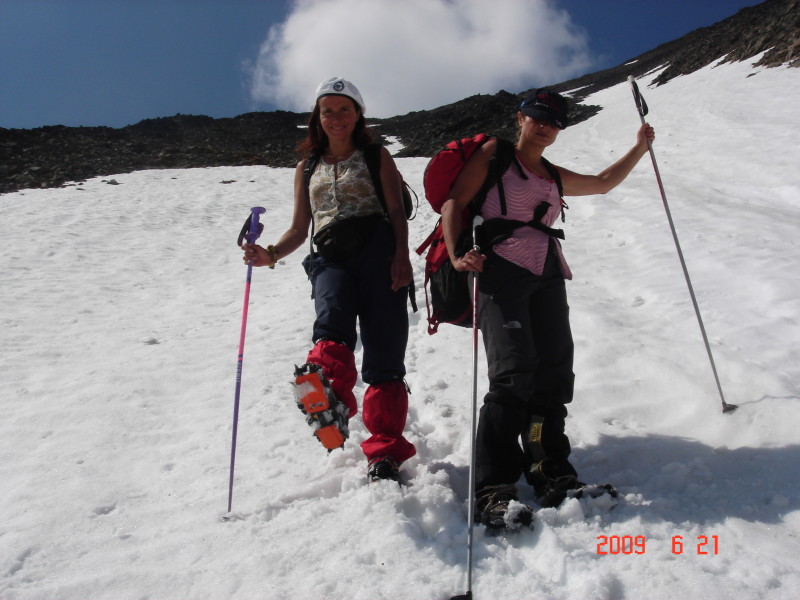 Решили не идти по гребню и ... при 25 градусах тепла на ярчайшем солнце вынуждены шлёпать по снегу в кошках, потому что местами под снегом скользкий лёд. Зато очень уверенно и с кайфом!