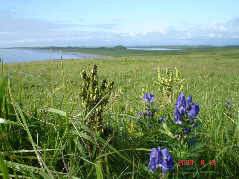 На побережье и особенно в районе озера растёт много аконита - самого ядовитого растения Камчатки, хотя и очень симпатичного.