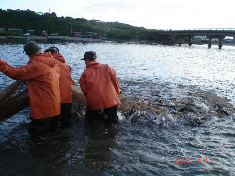 Прямо в пос. Озерновском бригады черпают нерку, которая рвётся в Курильское озеро