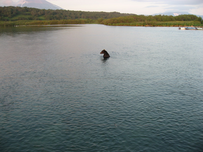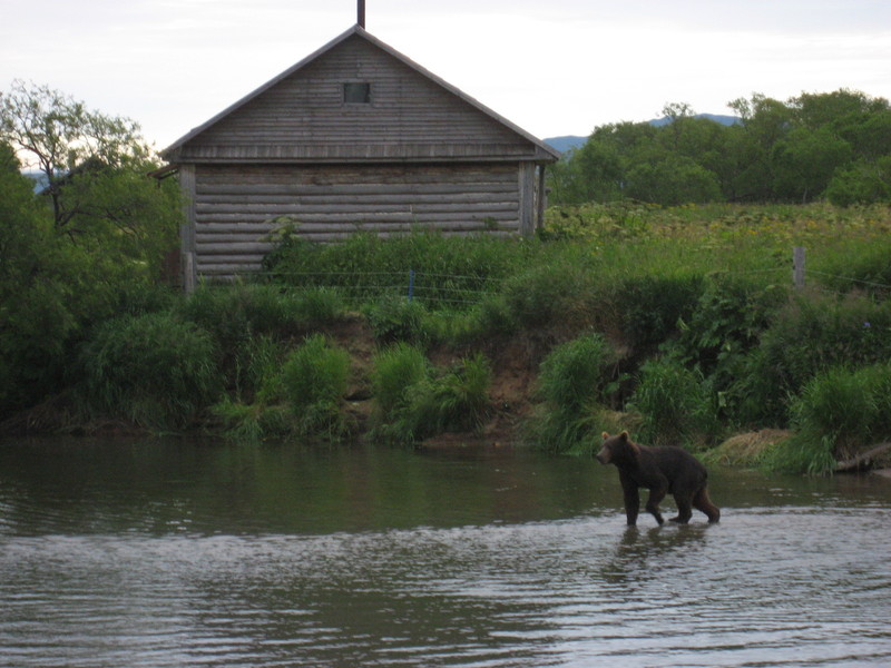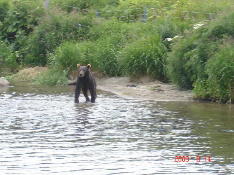 Этот мишка - местный доминант. У самой загородки его место рыбалки. Когда рявкнет, вся молодёжь дует на противоположный берег, сверкая пятками.