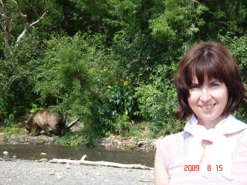 Медведица исправно лопала рыбу и позировала. Люди позировали как-то с напряжением и как я их не просил расслабиться, почему-то у них это не получалось. :-)