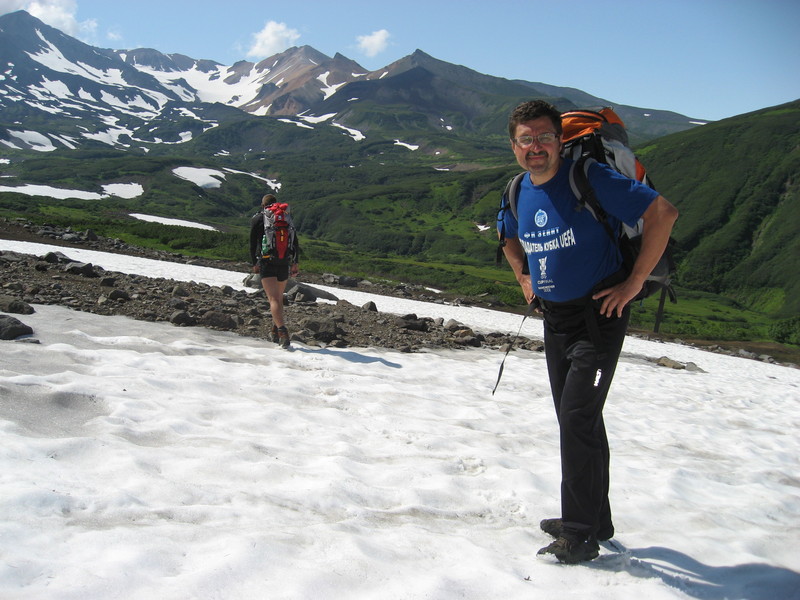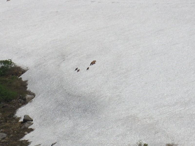Минут через 10 после нас на снежник вылезла медеведица со своим потомством и почапала в сторону Курильского озера.