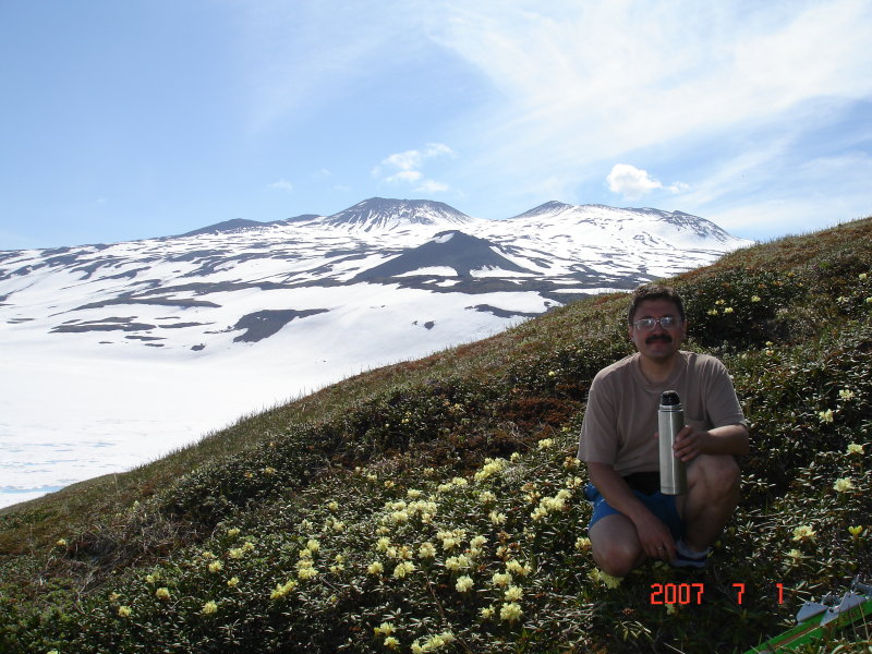 Начало, середина июля - это царство золотистых рододендронов на плато. Сзади меня отнюдь не мелкие горочки - это конусы Горелого.