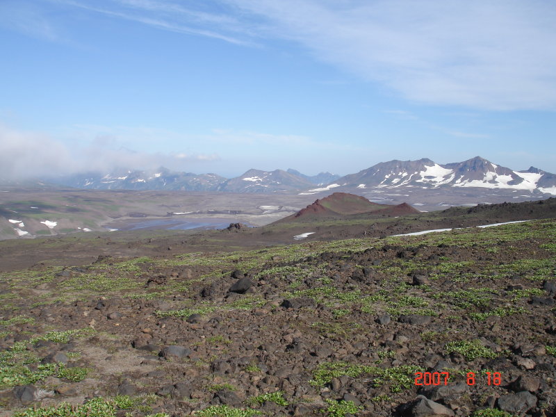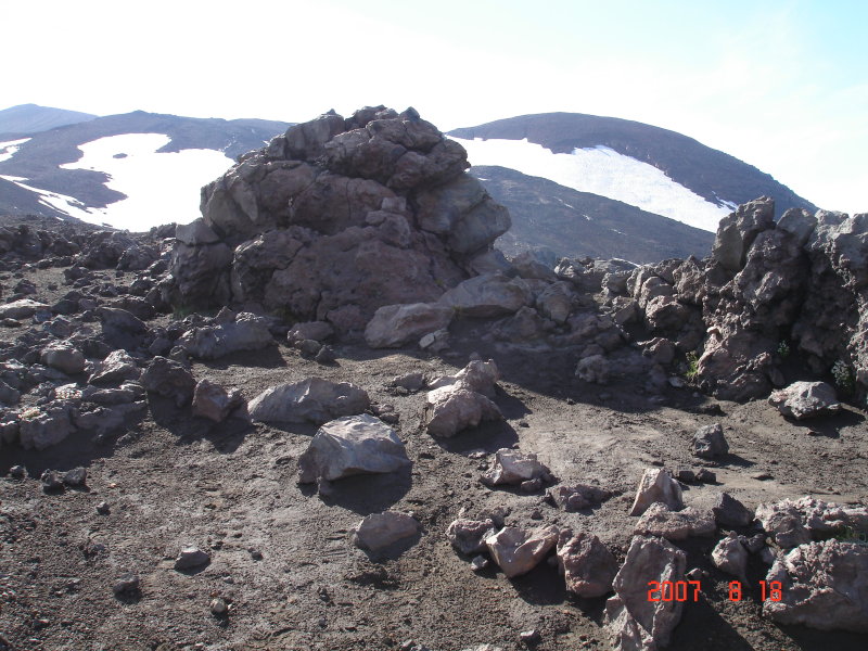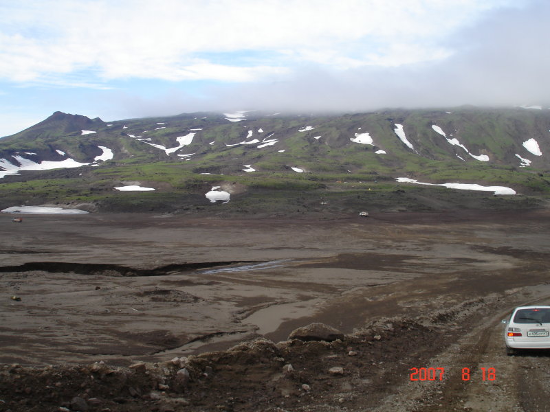 В начале июля плато ещё не растаяло и тающий снег парит на солнце. Конусы Горелого отлично просматриваются сквозь туман.