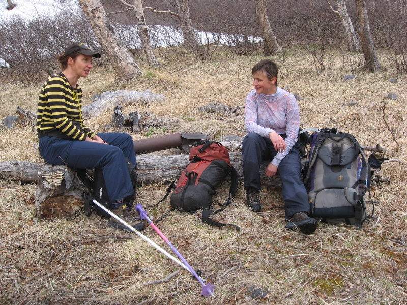 Вроде лето, но ничего не зеленеется. Рая - наш проводник (справа). Иногда давала отдохнуть в начале пути. Как показал дальнейший расклад, время надо было беречь. :)