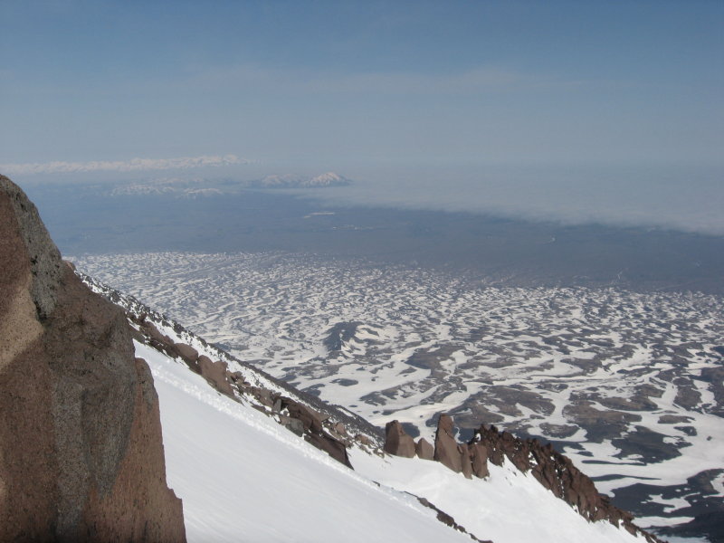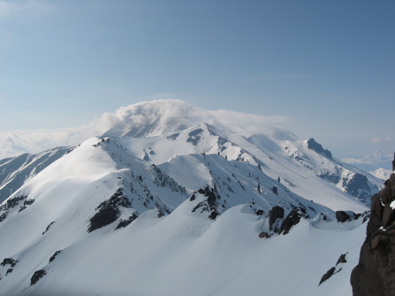 Авача в облаках. На обратной стороне Козельского стоят загадочные каменные останцы. Ну прям как на острове Пасхи. :)