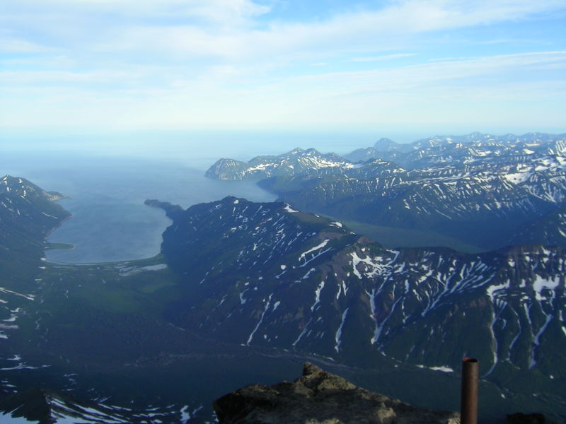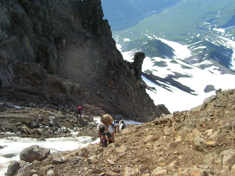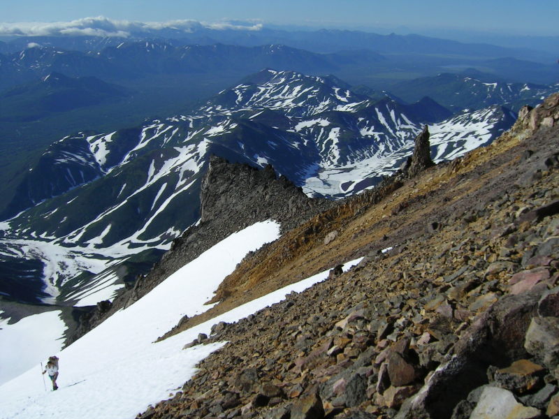 Вершина Вилючинского вулкана. Наверху в центре видны ворота, через которые надо пройти, чтобы добраться до вершины. После июля там зачастую вас поджидает лёд под тонким слоем снега.
