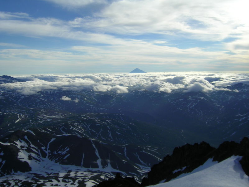 На вулканах часто бывает облачная шапочка. Такую шапочку на Вилючинском мы подкараулили впервые. |