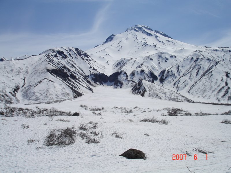 Один из самых близких и доступных вулканов для жителей Петропавловска, Елизово, Вилючинска - это вулкан Вилючинский. Высотой 2150м. От Елизово до него 50км по дороге. Активной вулканической деятельности на нем не найдёте, хотя все горячие источники вокруг берут тепло у него. Очень красивый и вполне покоримый. Хотя из всех близкодоступных маршрутов выходного дня - это, наверное, самый опасный, поскольку камнепады и лавинки на восхождениях я наблюдал часто. Восходить на него следует в июле, поскольку на самом верху вас ждут каменные ворота и метров 200 льда, мимо которого не пройти. До августа лёд обычно прикрыт снегом. До июля обычно снега ещё много и он очень неустойчив - вполне можно сорвать лавинку. Вокруг него огромное количество прелестей для маршрутов выходного дня - водопады, озёра, вулканчики, цветы, источники, перевалы, и.т.д.