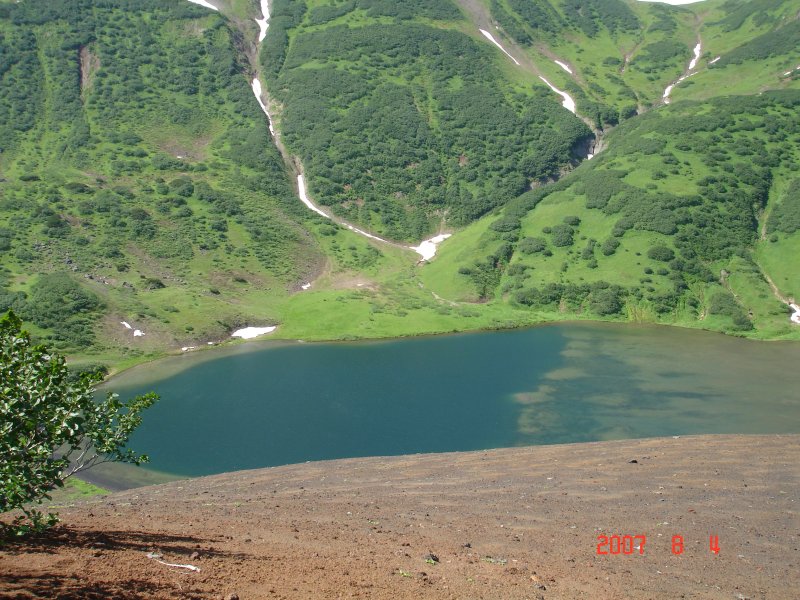 На север от Вилючинского под Зелёным вулканом находится Зелёное озеро. Вот вид на него со склона Зелёного вулкана. От дороги туда идти часа 2, если не идти напрямик через ольхач.